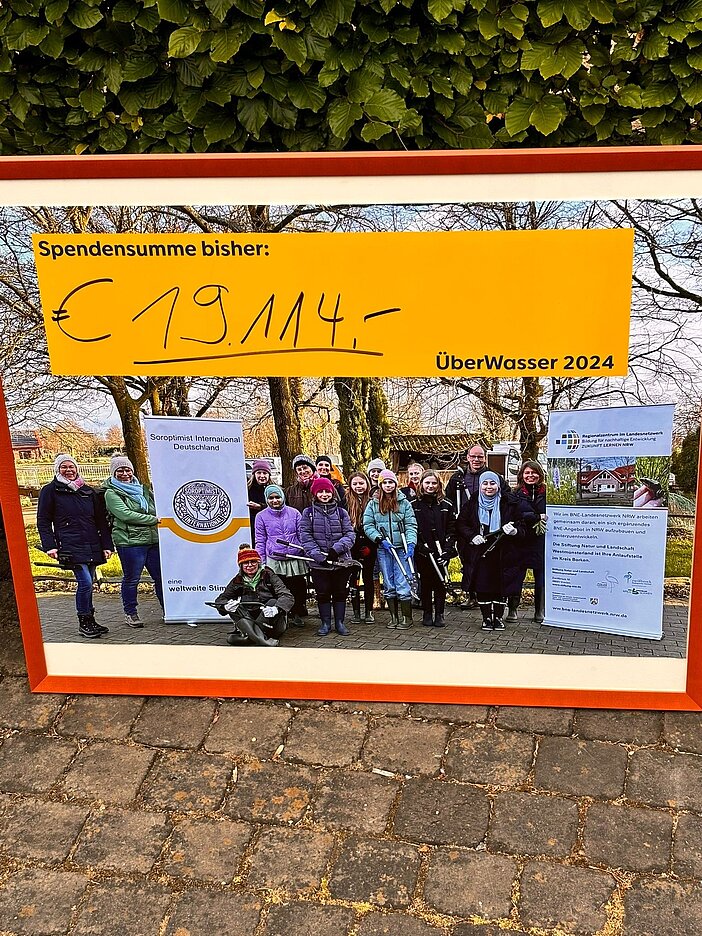 Im Rahmen des Projektabschlusses konnte eine Spendensumme i.H.v. 20.000 € an Dr. Dietmar Ikemeyer von der Stiftung NLW übergeben werden. Mit dem Geld kann unter anderem die Ertüchtigung von Flächen zurück zur Feuchtwiese unterstützt werden.